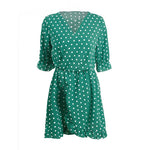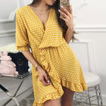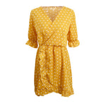 Gender: WomenModel Number: TC349Silhouette: A-LineSleeve Style: RegularDresses Length: Above Knee, MiniWaistline: EmpireSeason: SummerBrand Name: GUMPRUNNeckline: V-NeckSleeve Length(cm): HalfPattern Type: DotMaterial: Lanon,PolyesterDecoration: RufflesStyle: Casual